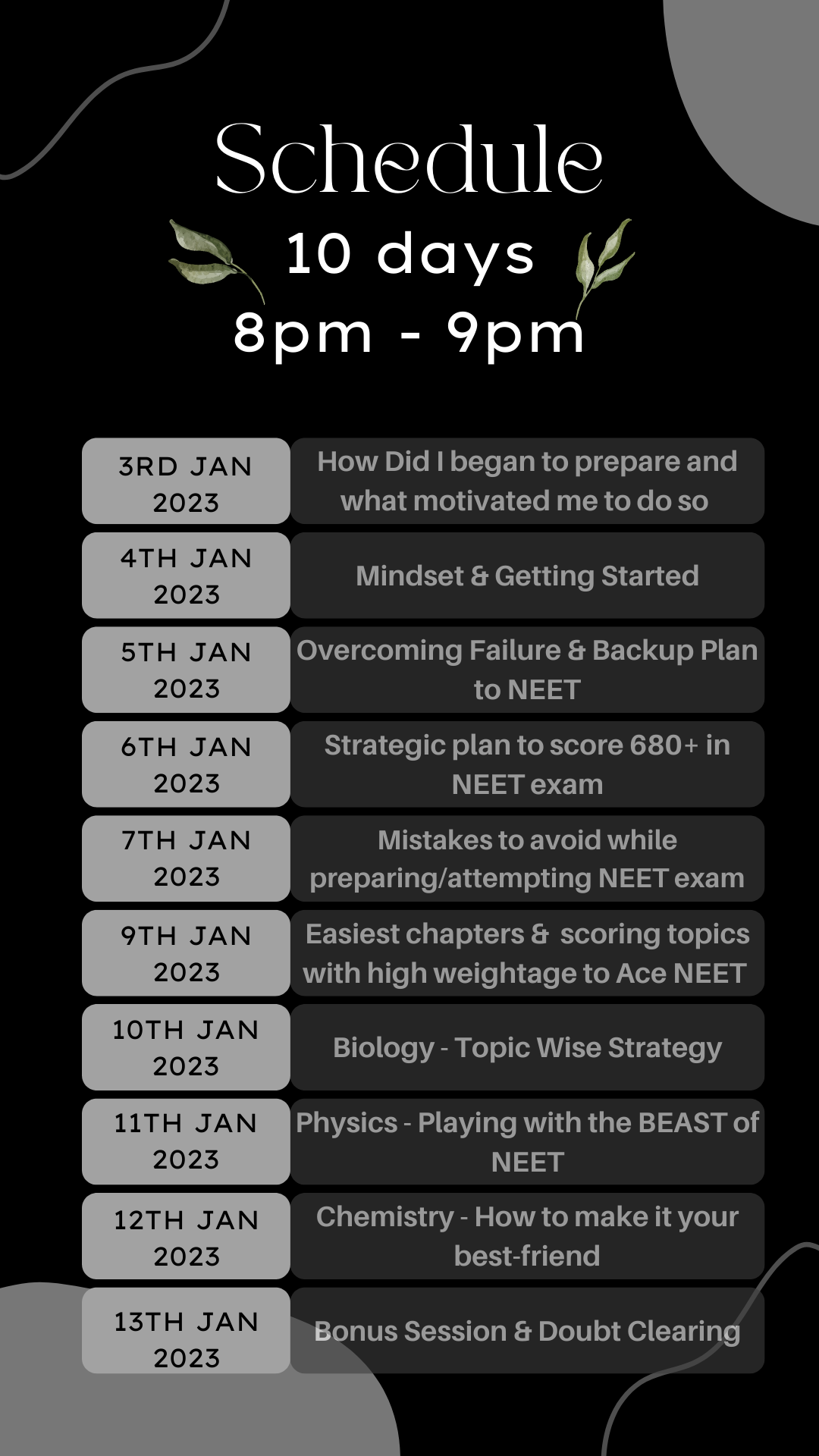 By joining my exclusive masterclass and putting in the work, you’ll have the opportunity to take control of this exam. I will be sharing my preparation strategy for NEET during my school time where one has to manage both pre-medical exam preparation as well as board exam preparation. I will also be sharing tips on how to overcome the challenges faced during the NEET preparation which can be followed by all medical aspirants and how to improve the speed and accuracy for clearing any competitive exam.